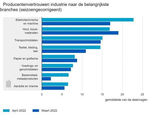Tegen de trend in is het producentenvertrouwen in de hout- en bouwmaterialenindustrie in april gedaald. Gemiddeld ging het producentenvertrouwen van 8,7 in maart naar 10,8 in april, aldus het CBS. Voor de hout- en bouwmaterialenindustrie gold in diezelfde periode van 19,1 naar 16,9. Daarmee scoort de sector nog steeds ruim boven het gemiddelde. Het gemiddelde van alle sectoren van de afgelopen twintig jaar is 0,9. Het vertrouwen van de ondernemers bereikte in november 2021 de hoogste waarde (12,7) en in april 2020 de laagste waarde (-28,7).